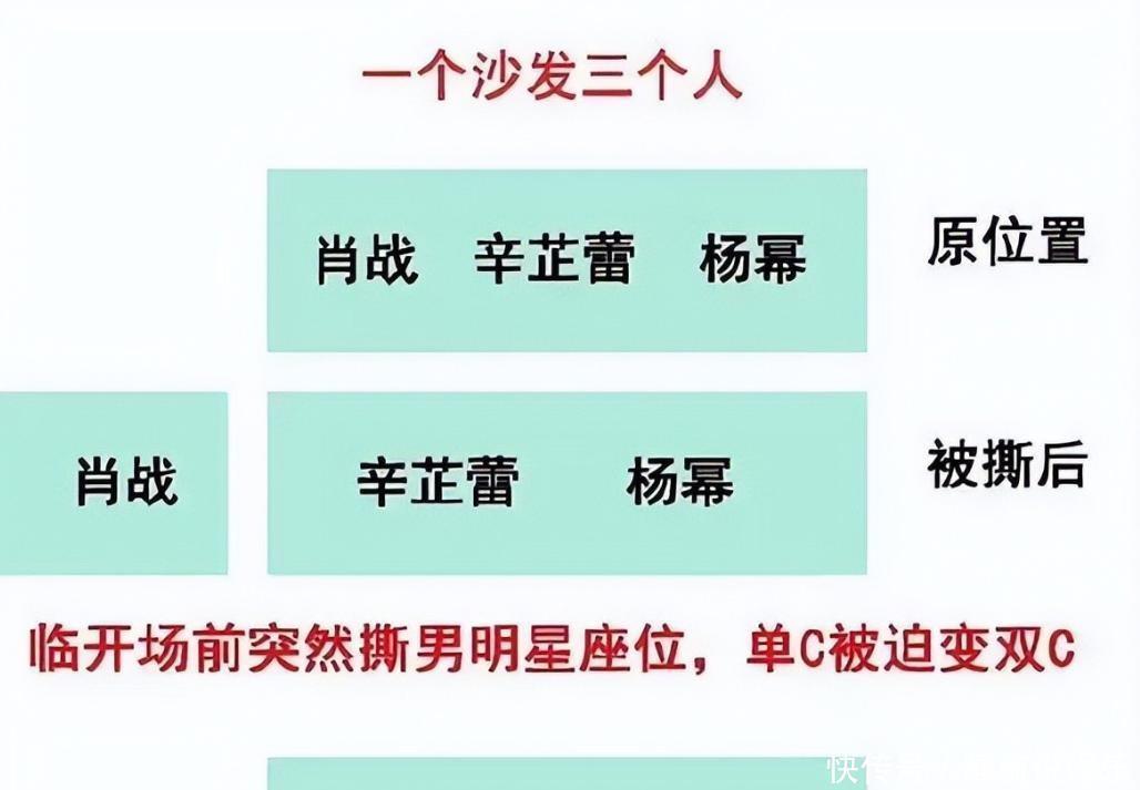 起初,肖战坐的名牌被换到了别的沙发上,原本三人坐的地方就只剩辛芷蕾和杨幂了,原本的单人中心位变成了两个中心位,肖战反倒被挤到了边上,那地方窄得他只能勉强坐下半个身子。面对这个变化,好多人都不满地抱怨起来,一下子就惹得大家都很生气。
